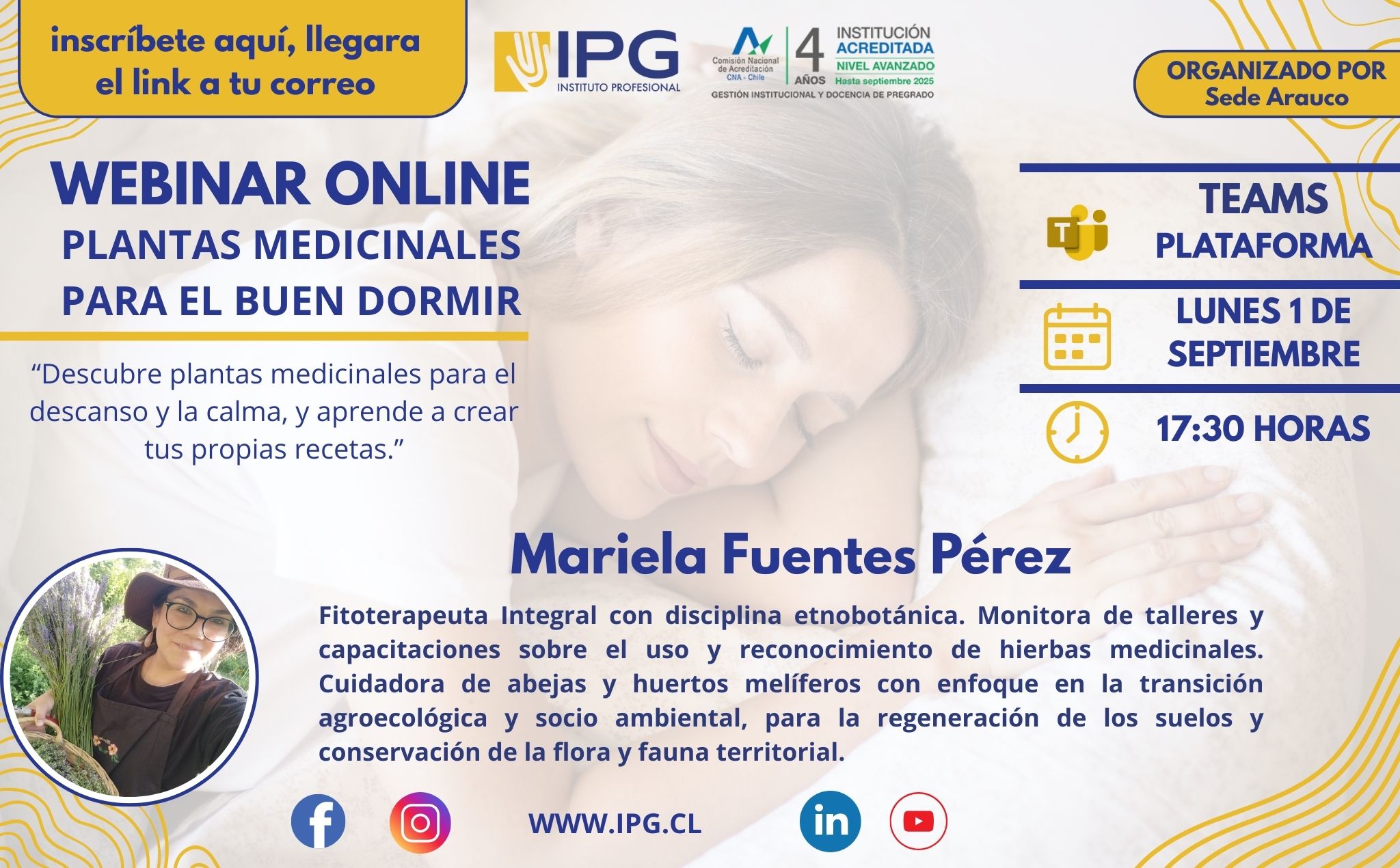 El martes 1 de septiembre de 2025, la sede Arauco del Instituto Profesional IPG llevó a cabo el webinar online “Plantas Medicinales para el Buen Dormir”, una jornada formativa orientada al bienestar, la salud natural y la vida equilibrada.