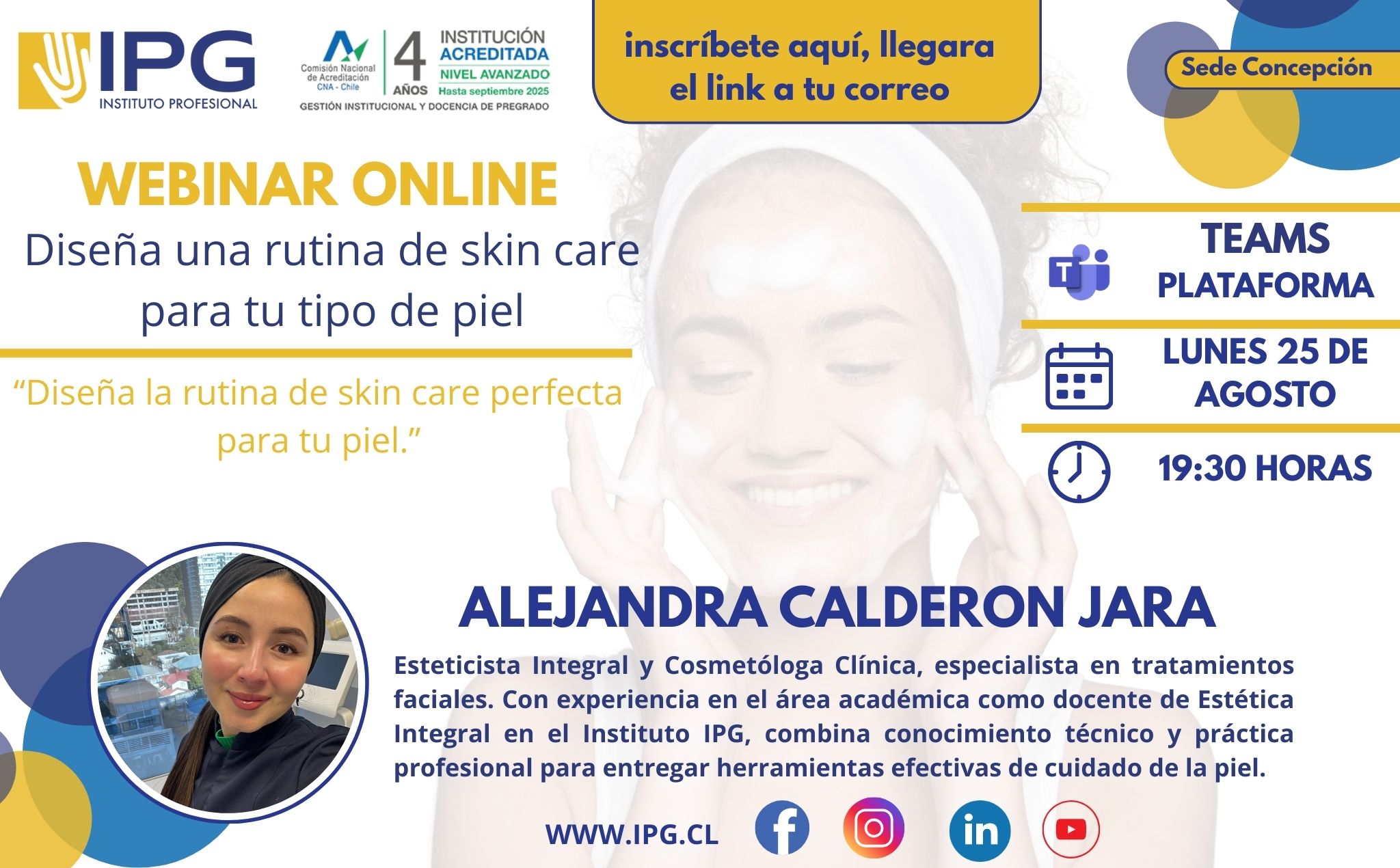 El lunes 25 de agosto, a las 19:30 horas, la sede Concepción del Instituto Profesional IPG realizó con éxito el webinar “Diseña una rutina de skin care para tu tipo de piel”, una instancia formativa que cautivó a estudiantes, titulados, docentes y público general interesado en el cuidado personal y la estética profesional. La jornada estuvo dirigida por Alejandra Calderón, Esteticista Integral y Cosmetóloga Clínica, docente de Estética Integral en IPG, quien gracias a su experiencia académica y trayectoria en tratamientos faciales entregó un enfoque práctico y técnico, guiando a los asistentes en la creación de rutinas efectivas y adaptadas a cada tipo de piel.